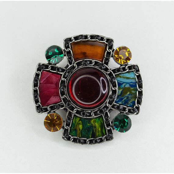 Брошь из гипоаллегенного ювелирного сплава серого цвета. Вставка -эпоксидная смола красного цвета, радужный пластик и ювелирное стекло, цвет-желтый, зеленый, синий. Высота броши -5см, ширина-5см. Застежка- булавка.