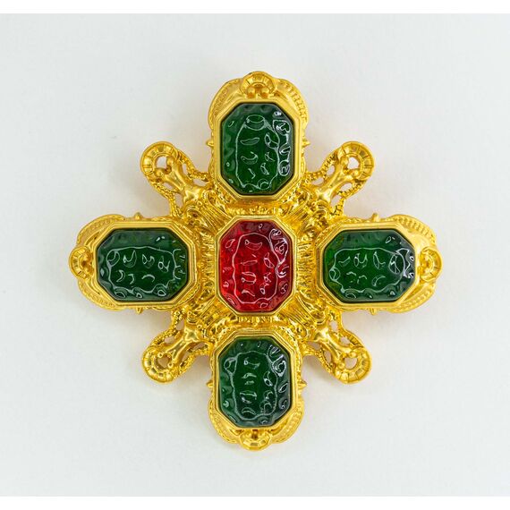 Брошь из гипоаллергенного ювелирного сплава, цвет-желтый. Вставка- ювелирная смола красного и зеленого цвета. Высота броши-6,5см, ширина-6,5см. Застежка- булавка.
