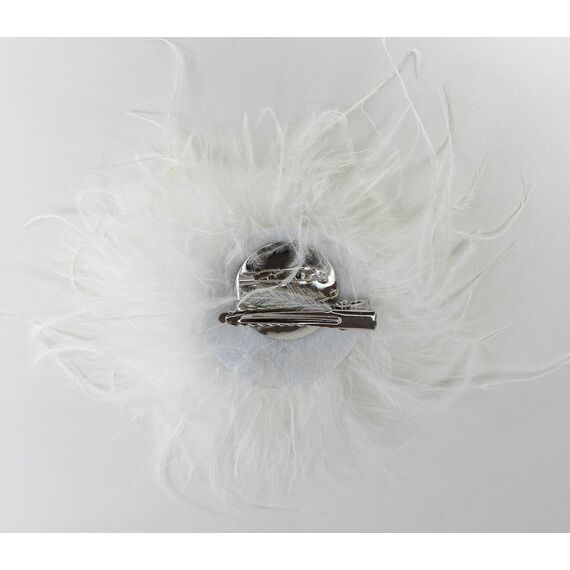 Брошь ( зажим) из гипоаллергенного ювелирного сплава серого цвета и страусинного пера, цвет- белый. Диаметр броши- 10,0см. Застежка- булавка и зажим (для волос).