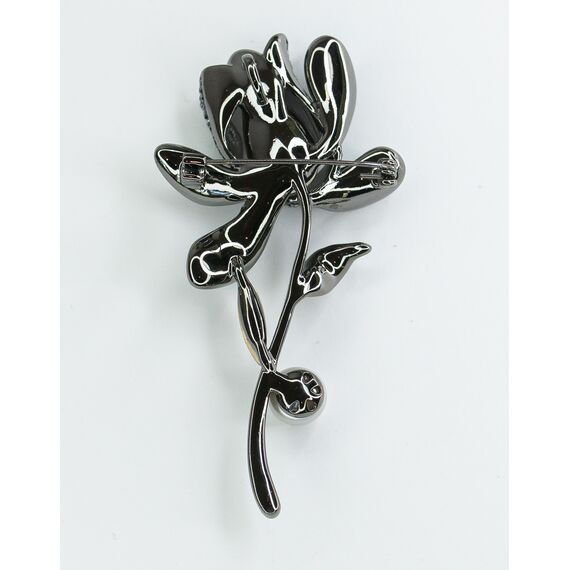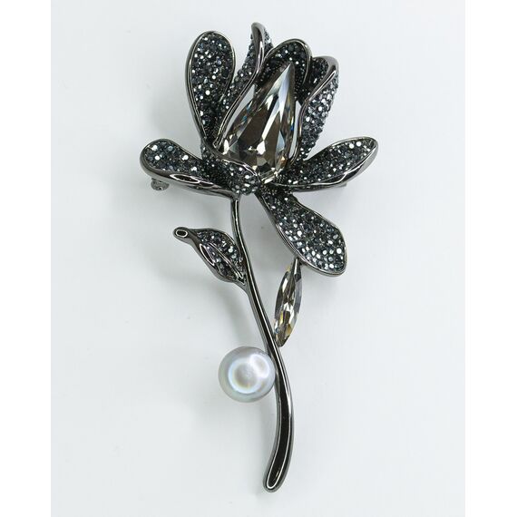 Брошь из гипоаллергенного ювелирного сплава желтого цвета. Вставка- циркон белого, фиолетового цвета и жемчуг,цвет- белый. Высота броши-5,0см, ширина-3,0см. Застежка- булавка.