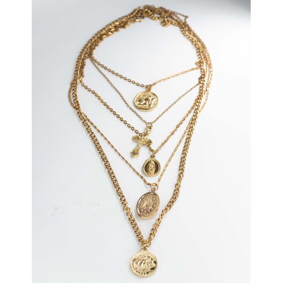 Колье многослойное из гипоаллергенного ювелирного сплава желтого цвета. Без вставок. Колье состоит из 5 цепочек разных плетений с подвесками. Длина колье-60,0см, застежка-карабин.