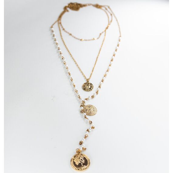 Колье многослойное с подвесками- монетами из гипоаллергенного ювелирного сплава желтого цвета. Вставка- иск. жемчуг белого цвета. Длина колье-70,0см, застежка-карабин.
