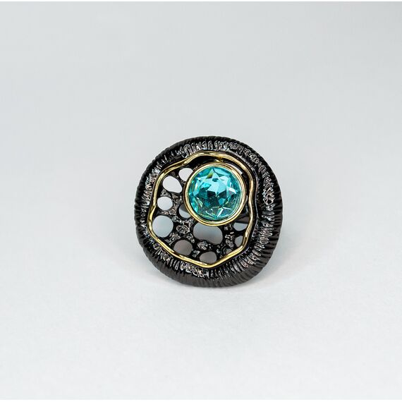 Кольцо из гипоаллергенного ювелирного сплава черного и желтого цвета. Вставка- ювелирное стекло ( диаметр камня-1,3см) ,цвет- голубой. Высота кольца-3см, ширина-3см. Размер кольца-18,0.