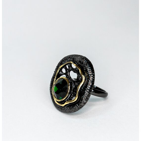 Кольцо из гипоаллергенного ювелирного сплава черного и желтого цвета. Вставка- ювелирное стекло ( диаметр камня-1,3см) ,цвет- зеленый. Высота кольца-3см, ширина-3см. Размер кольца-18,0.