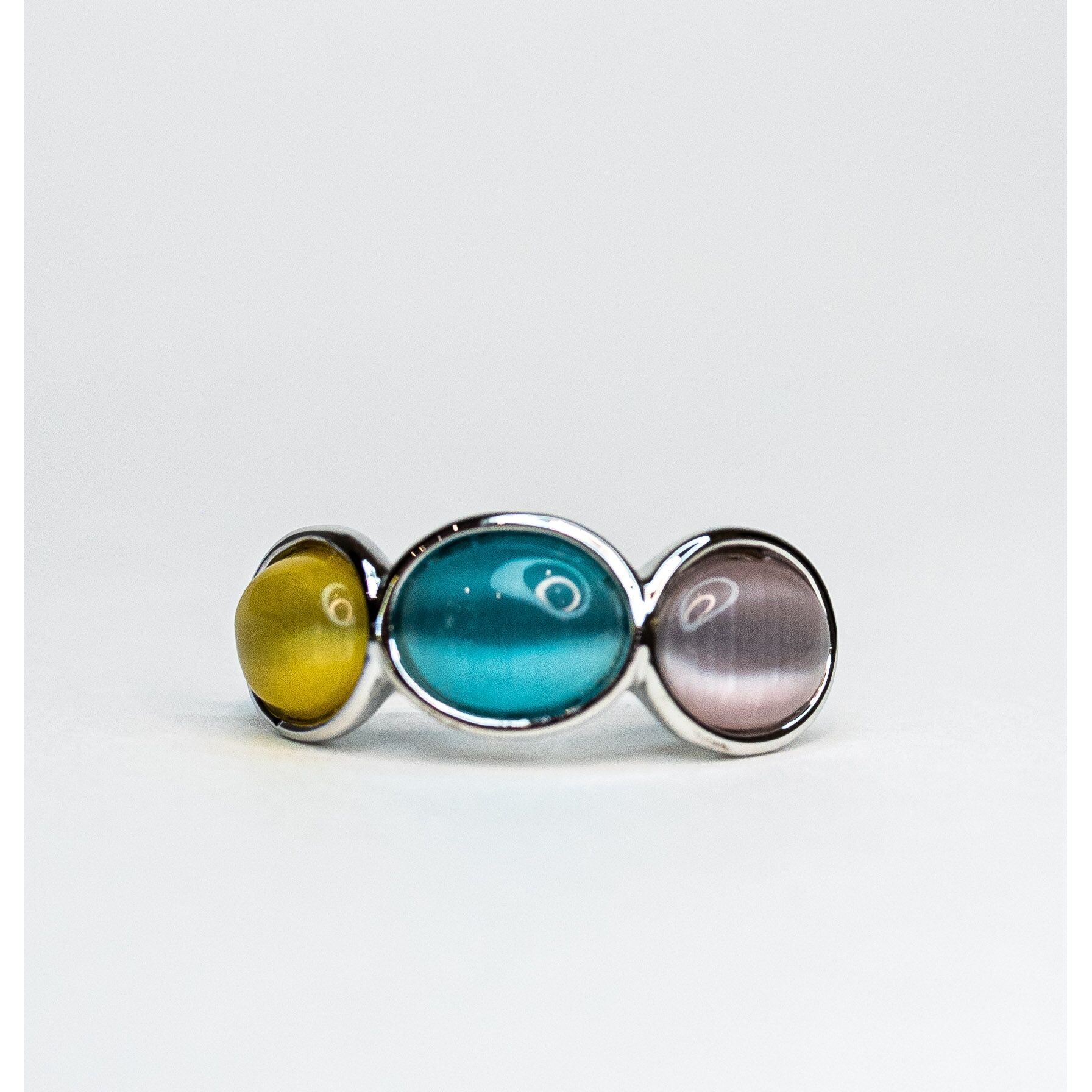 Кольцо из гипоаллергенного ювелирного сплава желтого и черного цвета . Вставка- улексит (кошачий глаз), цвет-голубой, желтый, сиреневый. Высота кольца-1см, ширина-3см. Размер-18,0.