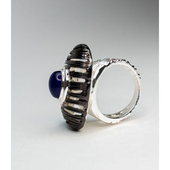 Кольцо из гипоаллергенного ювелирного сплава серого и черного цвета . Вставка-улексит (кошачий глаз), цвет синий. Высота кольца-2см, ширина-3см. Размер-18,0.