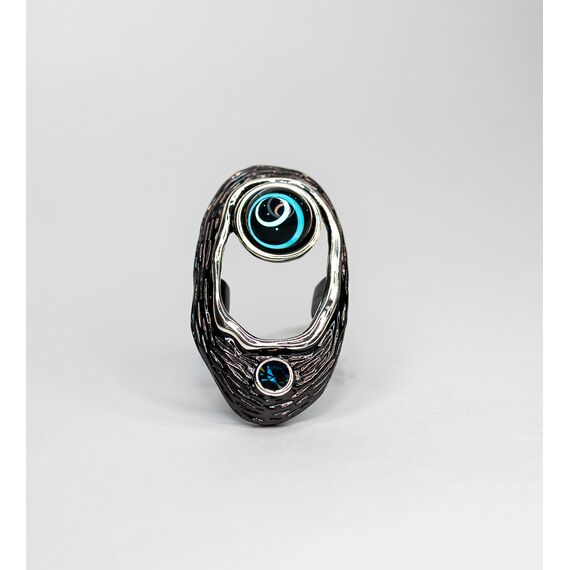 Кольцо из гипоаллергенного ювелирного сплава черного и серого цвета. Вставка- улексит ( кошачий глаз, диаметр камня-1см) цвета лондон блю и ювелирное стекло,цвет- синий. Высота кольца-4,5см, ширина-2см. Размер-18,0.