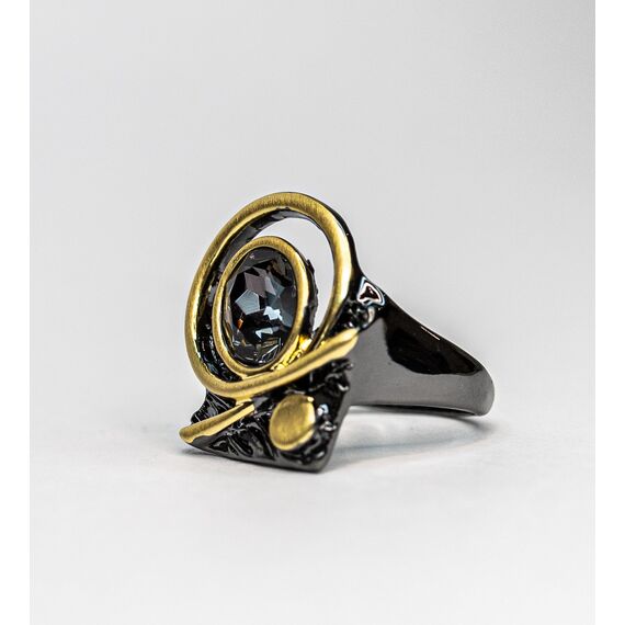 Кольцо из гипоаллергенного ювелирного сплава черного и желтого цвета. .Вставка-ювелирное стекло, цвет- серый. .Высота кольца-2см, ширина-2см. Размер-17,0.