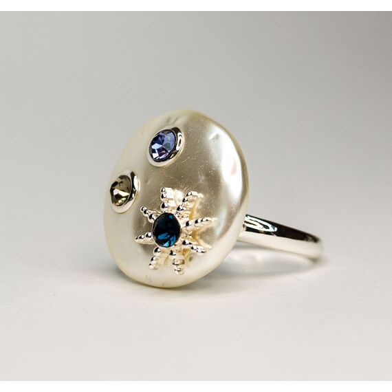 Кольцо из гипоаллергенного ювелирного сплава серого цвета.Вставка-иск. жемчуг белого цвета и ювелирное стекло,цвет-синий,серый,сиреневый.Диаметр жемчуга-2,5см.Размер кольца-18,0.