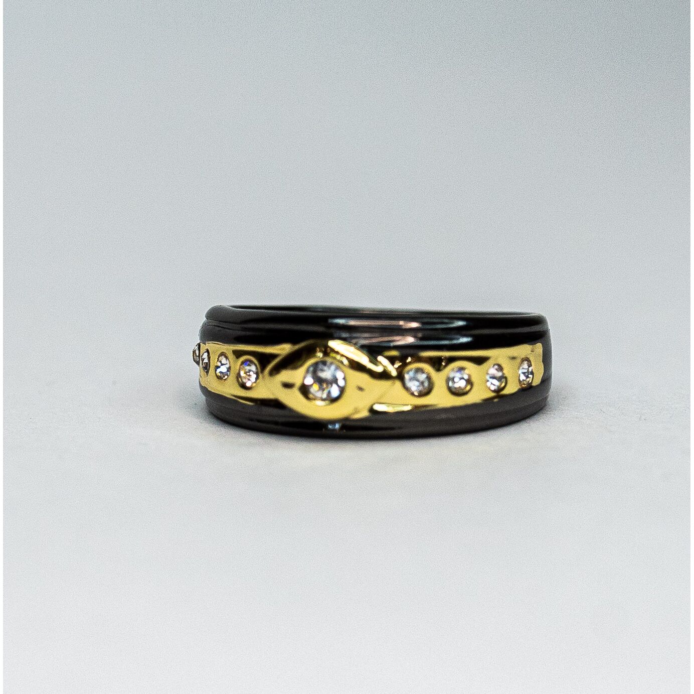 Кольцо женское из гипоаллергенного ювелирного сплава желтого и черного цвета. Вставка- ювелирное стекло белого цвета. Высота кольца-0,6см, ширина-2см. Размер-17,0.