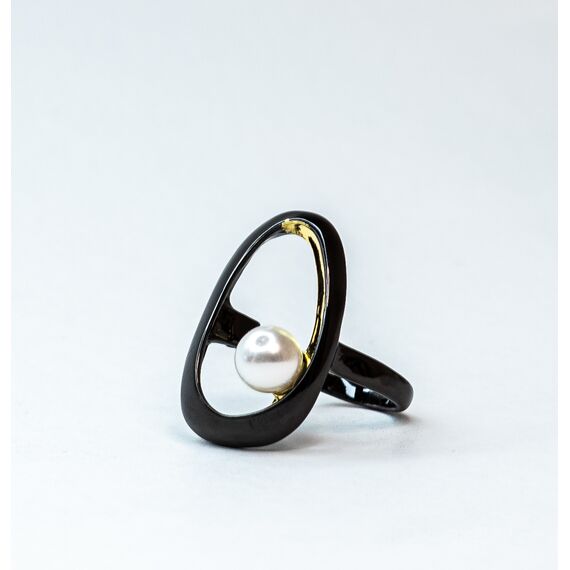 Кольцо из гипоаллергенного ювелирного сплава,цвет-черный,желтый.Вставка- иск. жемчуг белого цвета, диаметр камня-0,5см. Высота кольца-3см, ширина-2см. Размер -18,0.