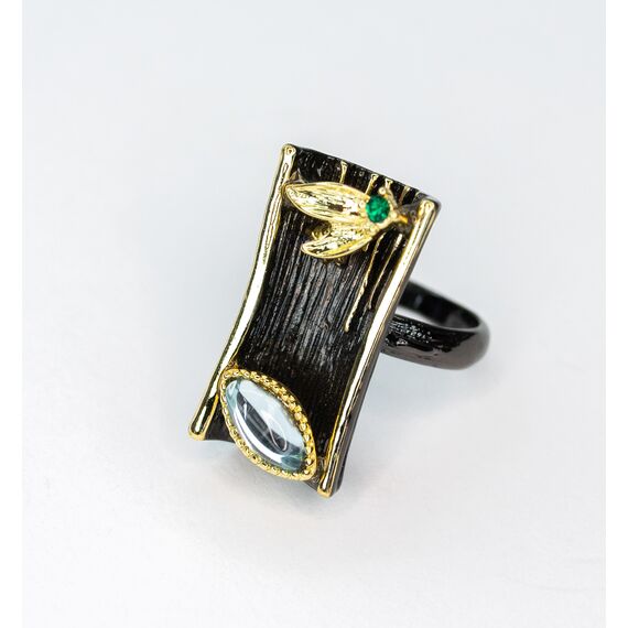 Кольцо из гипоаллергенного ювелирного сплава черного и желтого цвета . Вставка- ювелирное стекло голубого и зеленого цвета. Высота кольца-2,6см, ширина-1,4см. Размер-18,0.