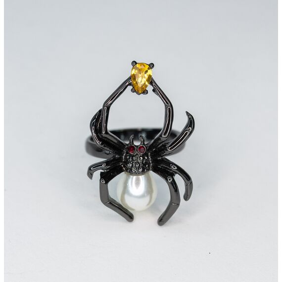 Кольцо из гипоаллергенного ювелирного сплава,цвет-черный.Вставка- иск. жемчуг белого цвета(размер камня-0,7 / 0,5см и ювелирное стекло красного и желтого цвета). Высота кольца-3см,ширина-2,см. Размер-18,0.