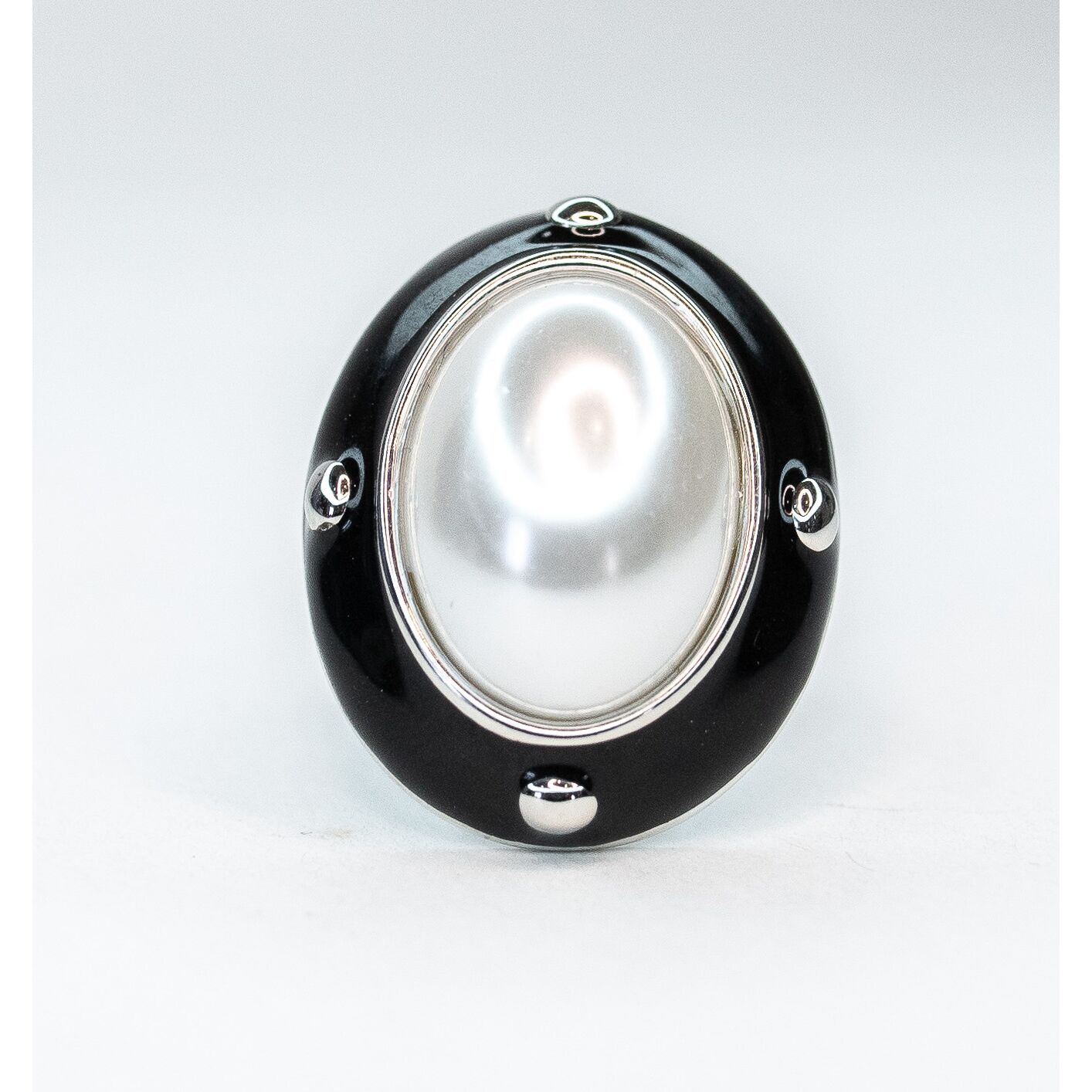 Кольцо женское из гипоаллергенного ювелирного сплава серого цвета. Вставка- иск. жемчуг белого цвета. Покрытие эмалью, цвет- черный. Высота кольца-2,5см, ширина-2см. Размер-17,0.