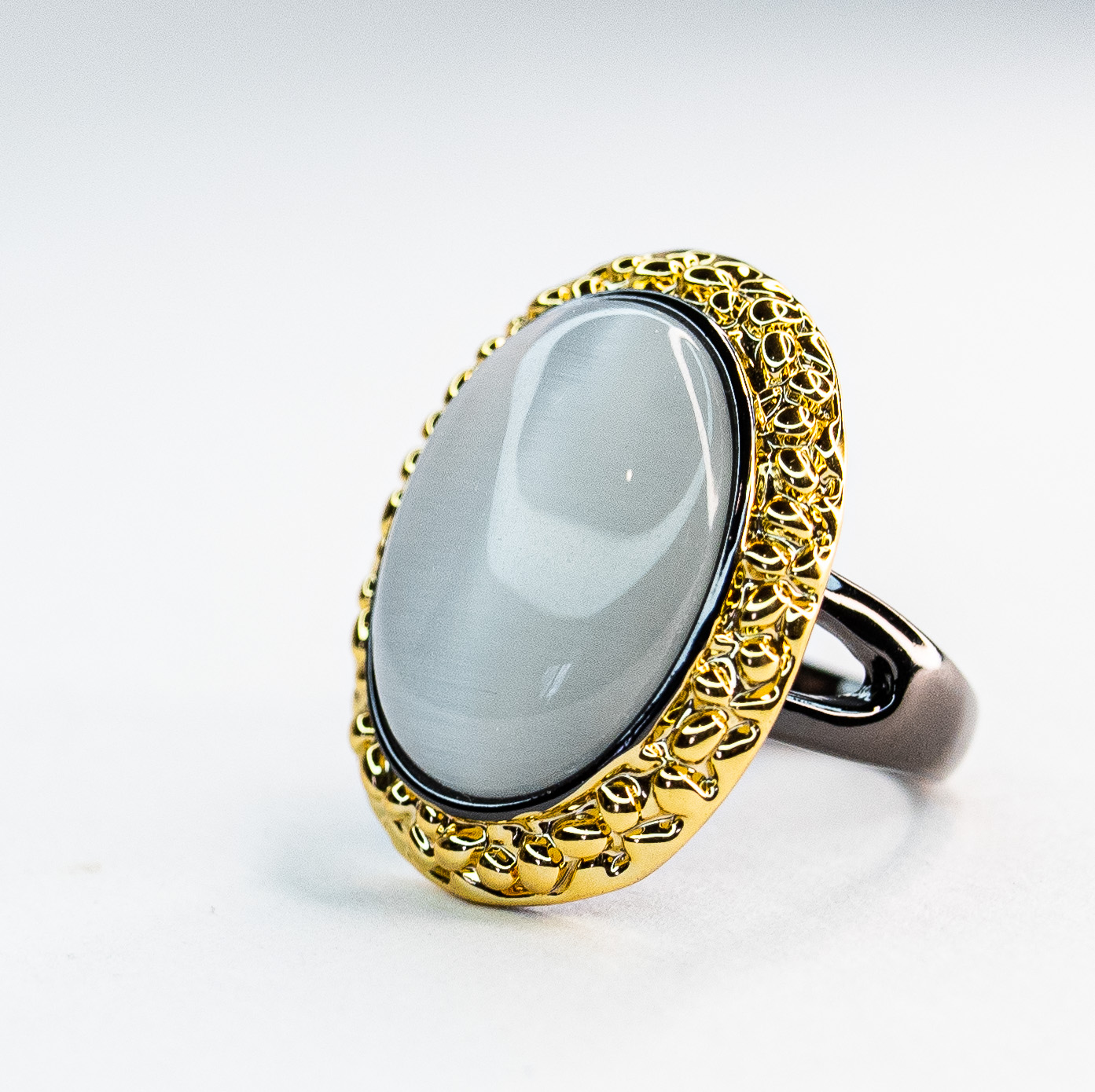 Кольцо из гипоаллергенного ювелирного сплава черного и желтого цвета . Вставка-улексит( кошачий глаз) серого цвета. Высота кольца-3см. ширина-2см. Размер-18,0.