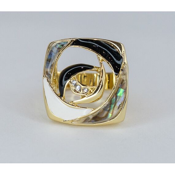 Кольцо женское из гипоаллергенного ювелирного сплава желтого цвета. Вставка- перламутр, цвет- радужный. Покрытие эмалью черного и белого цвета. Высота кольца-2,0см, ширина-2,0см. Размер-17,0.