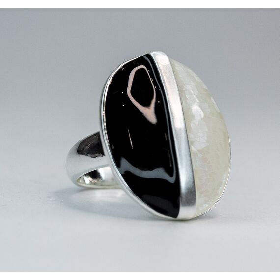 Кольцо из гипоаллергенного ювелирного сплава серого цвета. Покрытие эмалью черного цвета. Вставка - гелиотис (перламутр), цвет - белый. Высота кольца - 2,6см, ширина - 2,2см. Размер - 19,0.