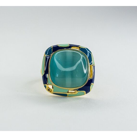 Кольцо женское из гипоаллергенного ювелирного сплава желтого цвета. Вставка- улексит( кошачий глаз) голубого цвета. Покрытие эмалью, цвет-синий, голубой, зеленый. Высота кольца-2см, ширина-2см. Размер-17,0.