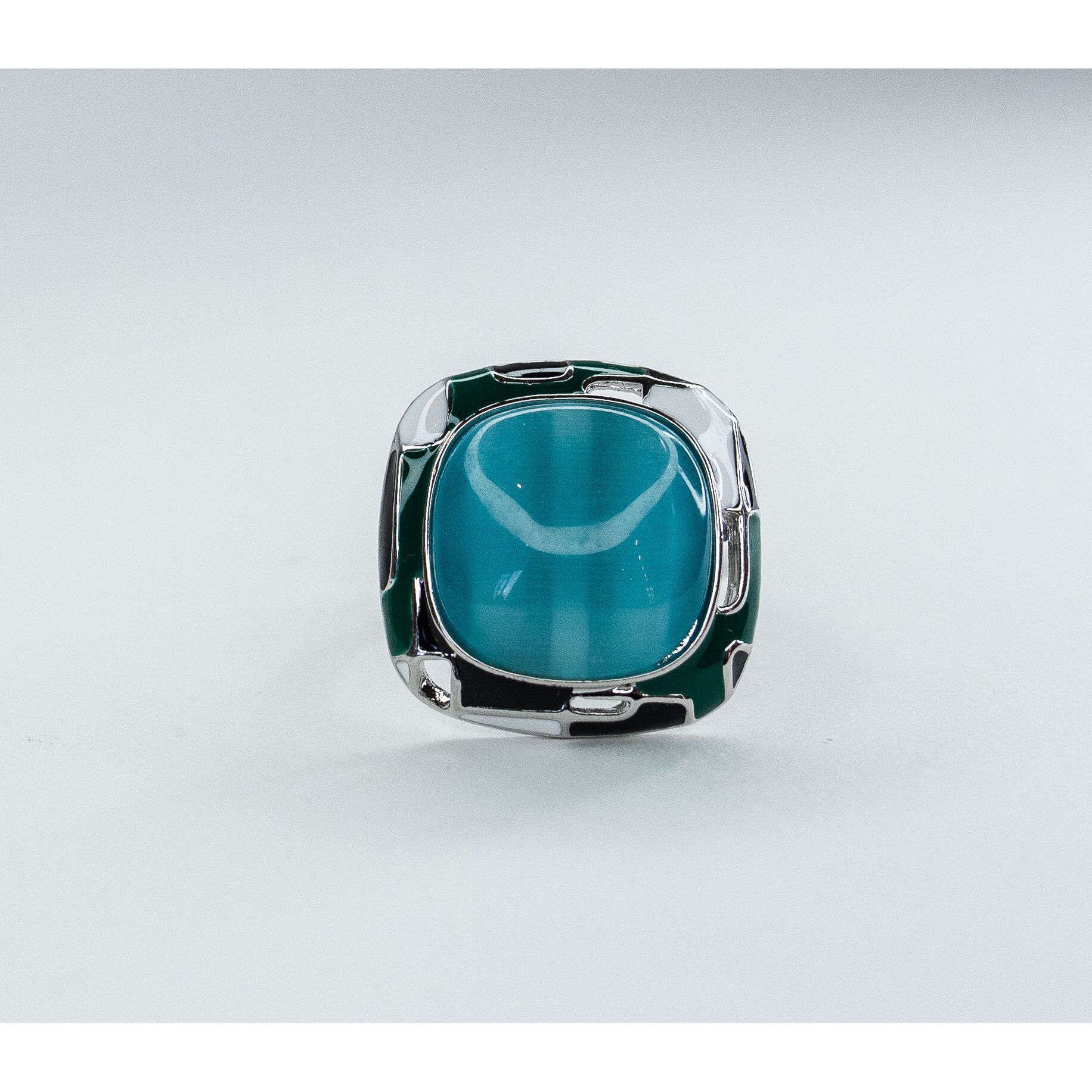 Кольцо женское из гипоаллергенного ювелирного сплава серого цвета. Вставка- улексит( кошачий глаз) голубого цвета. Покрытие эмалью, цвет-зелёный, белый,черный. Высота кольца-2см, ширина-2см. Размер-18,0.
