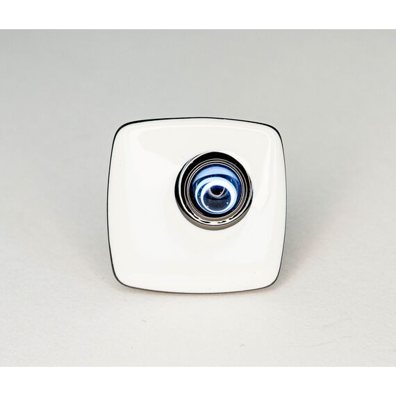 Кольцо из гипоаллергенного ювелирного сплава черного цвета. Покрытие эмалью белого цвета. Вставка- улексит (кошачий глаз), цвет- голубой, диаметр камня-0,8см. Высота кольца-2,5см, ширина-2,5см. Размер-18,0.