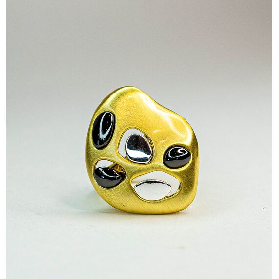 Кольцо женское из гипоаллергенного ювелирного сплава черного,серого и желтого цвета. Без вставок. Высота кольца-3см, ширина-2,5см. Размер-18,0.