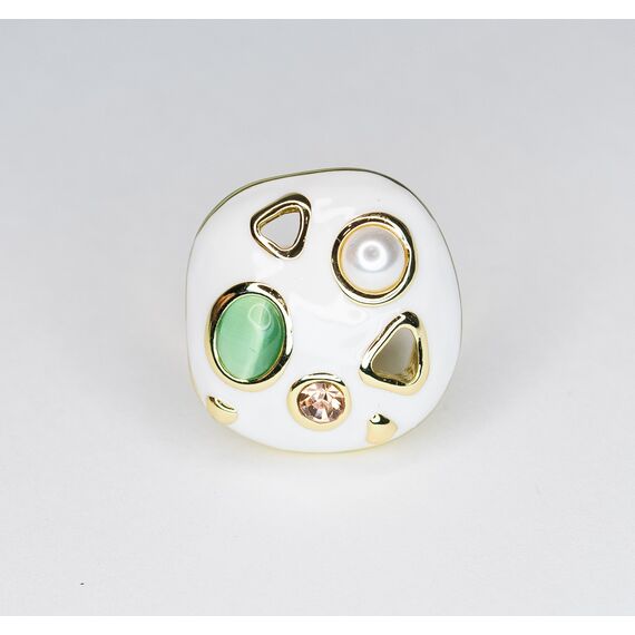 Кольцо из гипоаллергенного ювелирного сплава желтого цвета. Покрытие эмалью белого цвета. Вставка - жемчуг белого цвета, гелиотис (перламутр), цвет - зеленый и ювелирное стекло, цвет - розовый. Высота и ширина кольца - 2,6см. Размер - 18,0.
