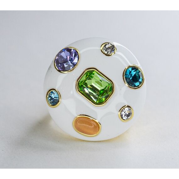 Кольцо женское из гипоаллергенного ювелирного сплава желтого цвета. Покрытие эмалью белого цвета. Вставка-улексит ( кошачий глаз) оранжевого цвета и ювелирное стекло белого, зеленого, голубого, сиреневого цвета. Высота кольца-3см, ширина-3см. Размер-18,0.