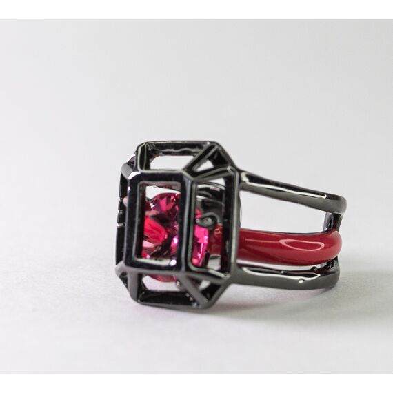 Кольцо женское из гипоаллергенного ювелирного сплава черного цвета с покрытием эмалью красного цвета. Вставка- ювелирное стекло, цвет- красный. Высота кольца-2,0см, ширина-2,0см. Размер-17,0.