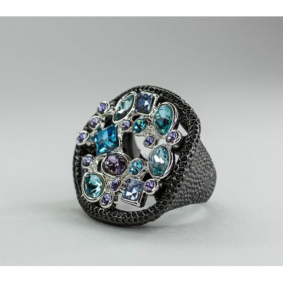Кольцо из гипоаллергенного ювелирного сплава черного и серого цвета. Вставка- кварц, цвет- голубой, фиолетовый. Высота кольца-3см, ширина-3см. Размер-19,0.