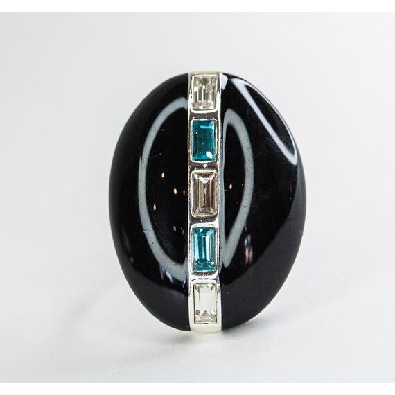 Кольцо из гипоаллергенного ювелирного сплава серого цвета. Покрытие- эмаль черного цвета. Вставка- ювелирное стекло, цвет-белый, голубой. Высота кольца-3см, ширина-2,5см. Размер-18,0.