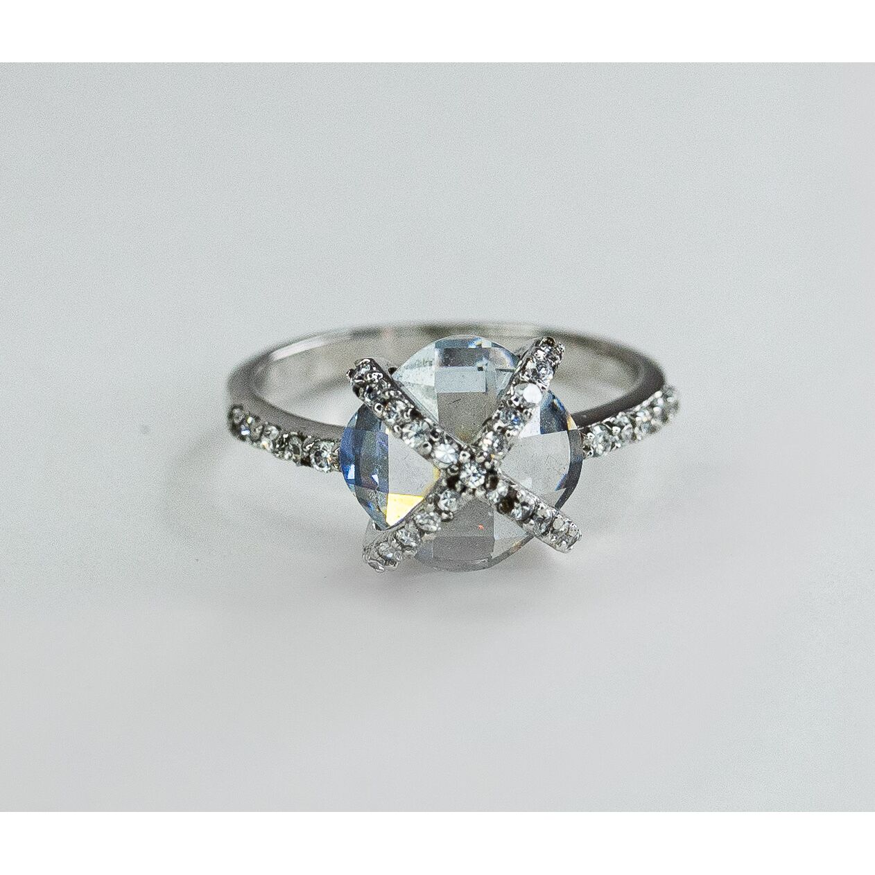 Кольцо женское из гипоаллергенного ювелирного сплава серого цвета. Вставка- ювелирное стекло белого цвета. Высота кольца-1,2см, ширина-2см. Размер-18,0.