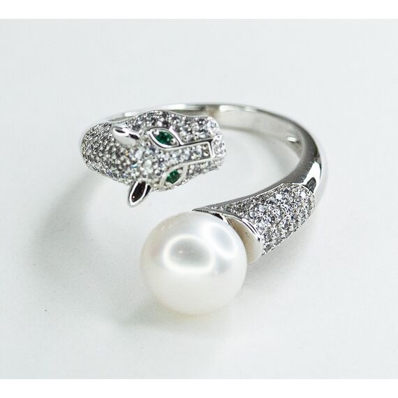 Кольцо из гипоаллергенного ювелирного сплава серого цвета. Вставка- иск. жемчуг белого цвета( диаметр камня-0,9см) и ювелирное стекло, цвет- зеленый . Высота кольца-1,6см, ширина-2,2см, размер-17,0. Кольцо разъёмное.
