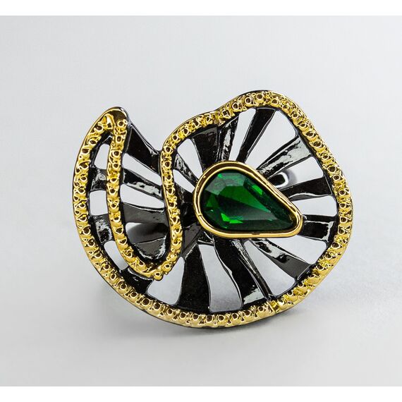 Кольцо из гипоаллергенного ювелирного сплава желтого и черного цвета. Вставка- ювелирное стекло зеленого цвета. Высота кольца - 2,5см, ширина - 3см. Размер-17,0.