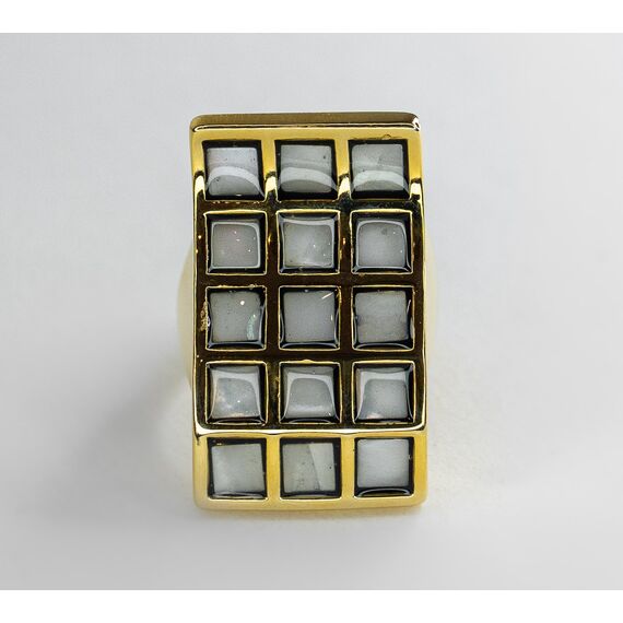Кольцо из гипоаллергенного ювелирного сплава желтого цвета. Вставка - гелиотис (перламутр), цвет -серый. Высота кольца - 3см, ширина - 1,7см. Размер-18,0.
