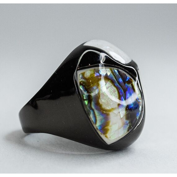 Кольцо из гипоаллергенного ювелирного сплава серого цвета. Вставка - гелиотис ( перламутр) ,цвет -белый и микс. Покрытие- эмаль черного цвета. Диаметр кольца-2,5см. размер-17,0.