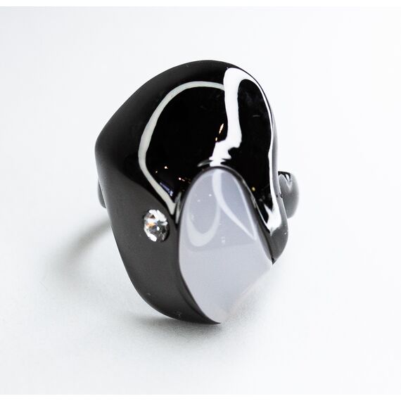 Кольцо женское из гипоаллергенного ювелирного сплава черного цвета. Вставка- ювелирное стекло белого цвета и пластик серого цвета. Высота кольца-2,5см, ширина-2см. Размер-18,0.