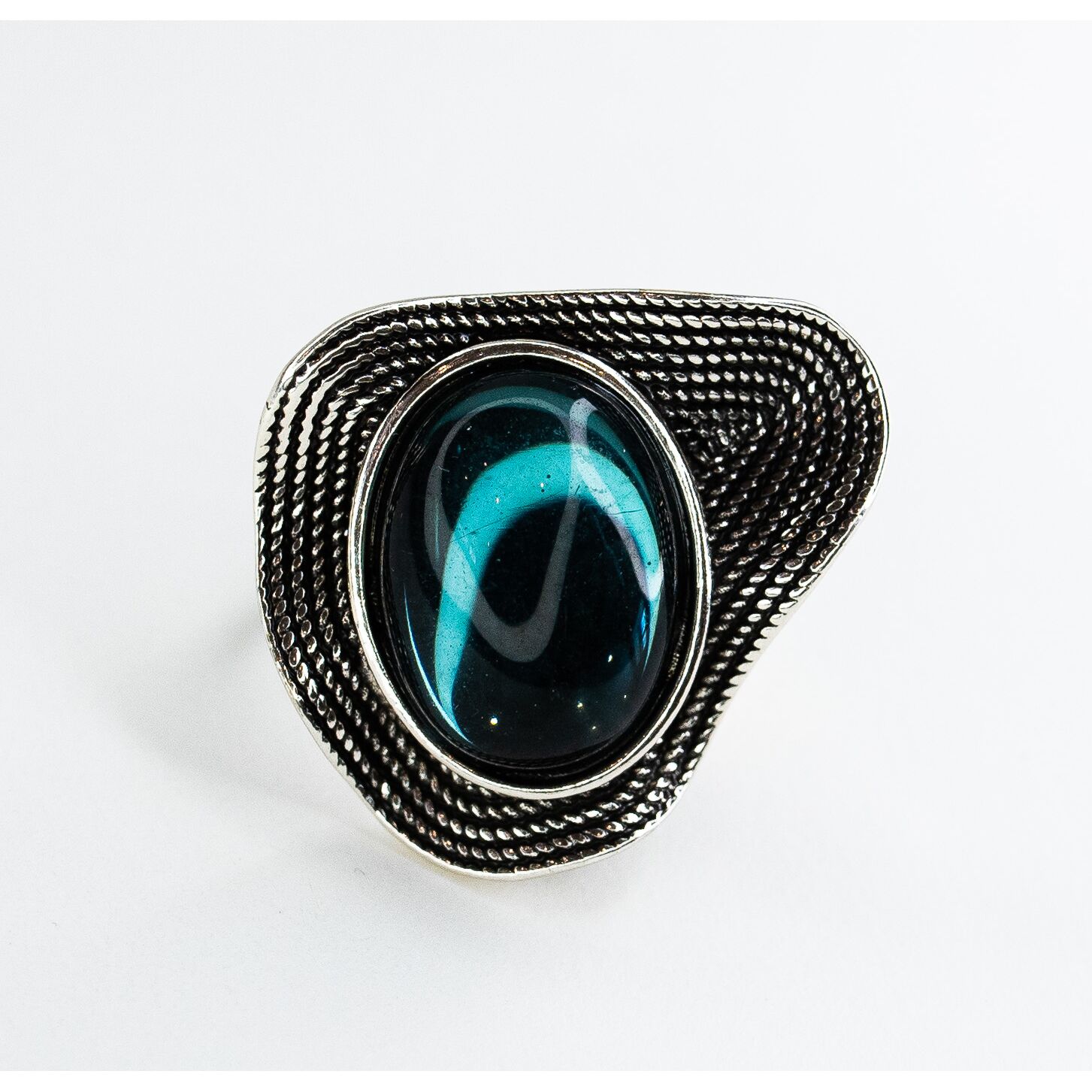 Кольцо из гипоаллергенного ювелирного сплава серого цвета. Вставка- улексит( кошачий глаз),цвет- лондон блю. Размер кольца-18,0, высота-2,5см. ширина-3,5см.