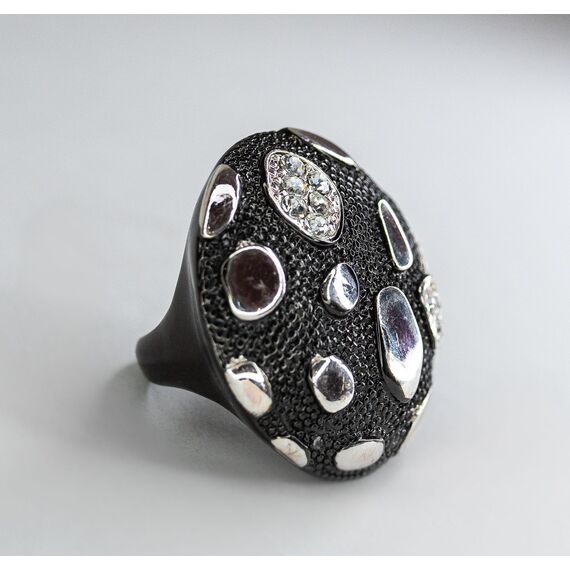 Серьги из гипоаллергенного ювелирного сплава черного и серого цвета. Вставка- ювелирное стекло белого цвета. Высота кольца-3,5см, ширина-3,0см. Размер-17,0.