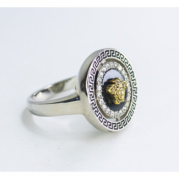 Кольцо женское из гипоаллергенного ювелирного сплава желтого и серого цвета. Вставка- ювелирное стекло белого цвета.Покрытие эмалью черного цвета. Диаметр кольца-2см.Размер-18,0.