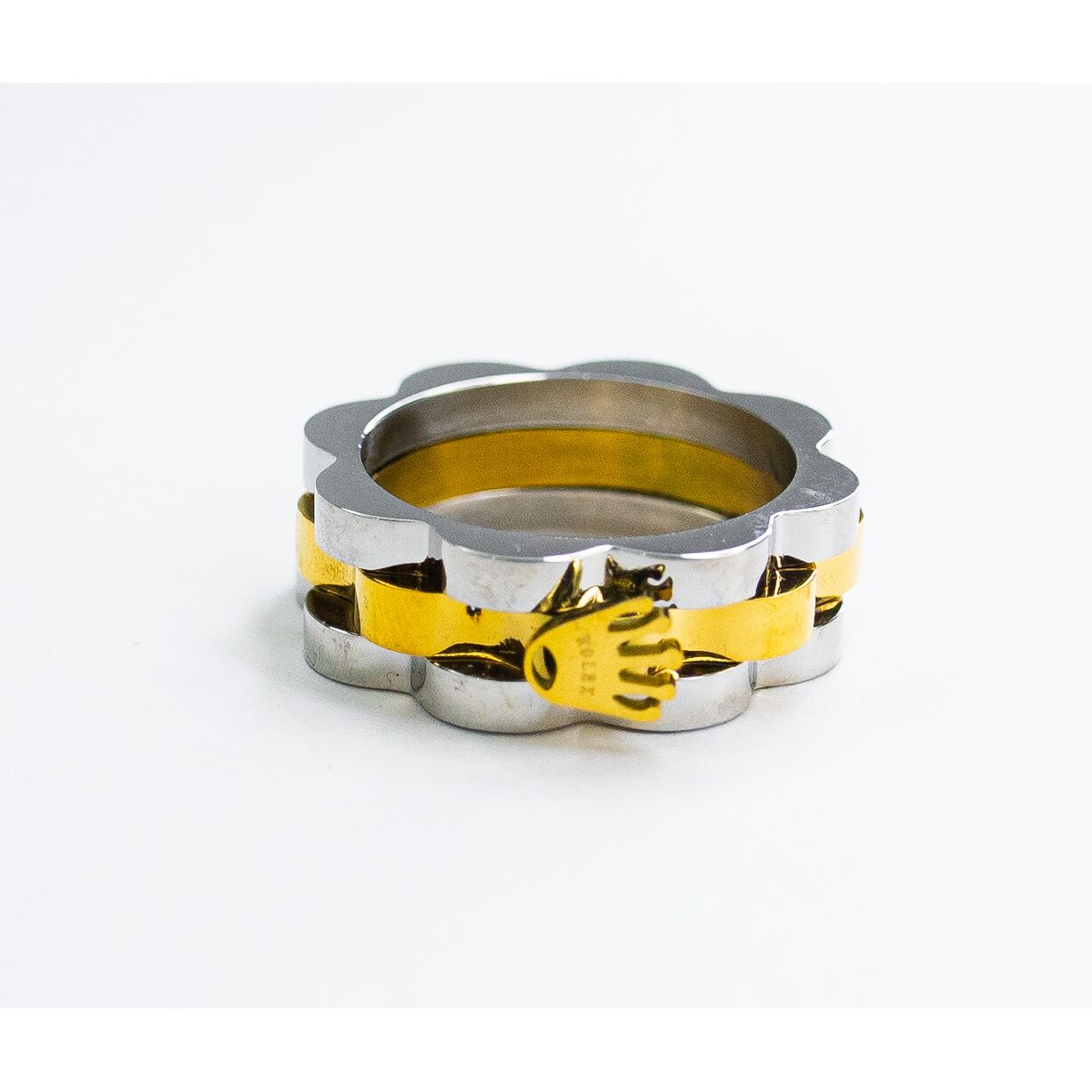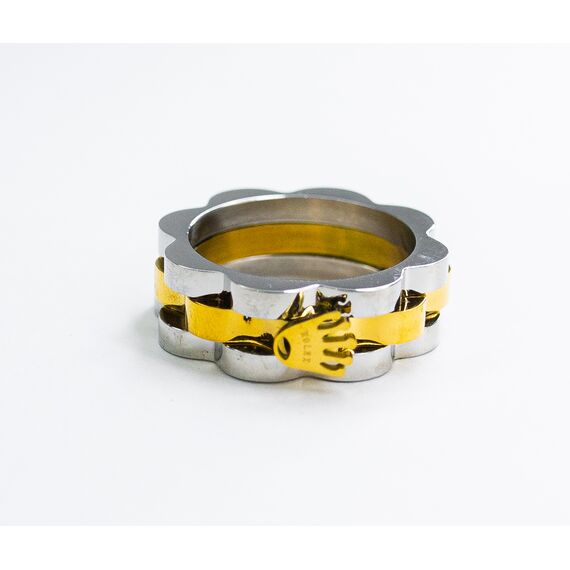 Кольцо женское из гипоаллергенного ювелирного сплава серого и желтого цвета. Без вставок. Высота кольца-0,7см, ширина-2см.Размер-18,0.