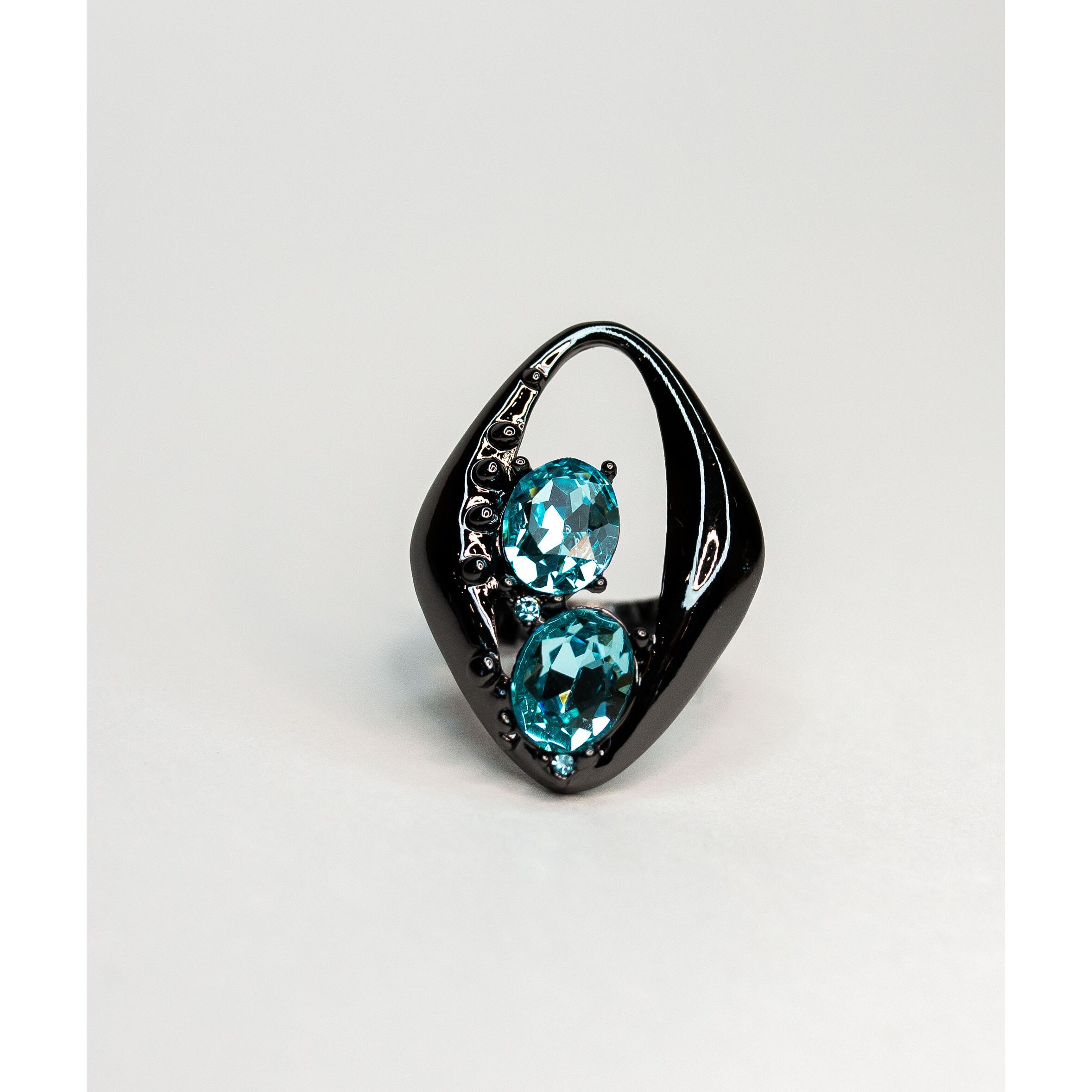Кольцо из гипоаллергенного ювелирного сплава черного цвета. Вставка- ювелирное стекло (размер камня-1,0/0,8см) ,цвет- голубой. Высотакольца-3,5см, ширина-2,5см. Размер-17,0.
