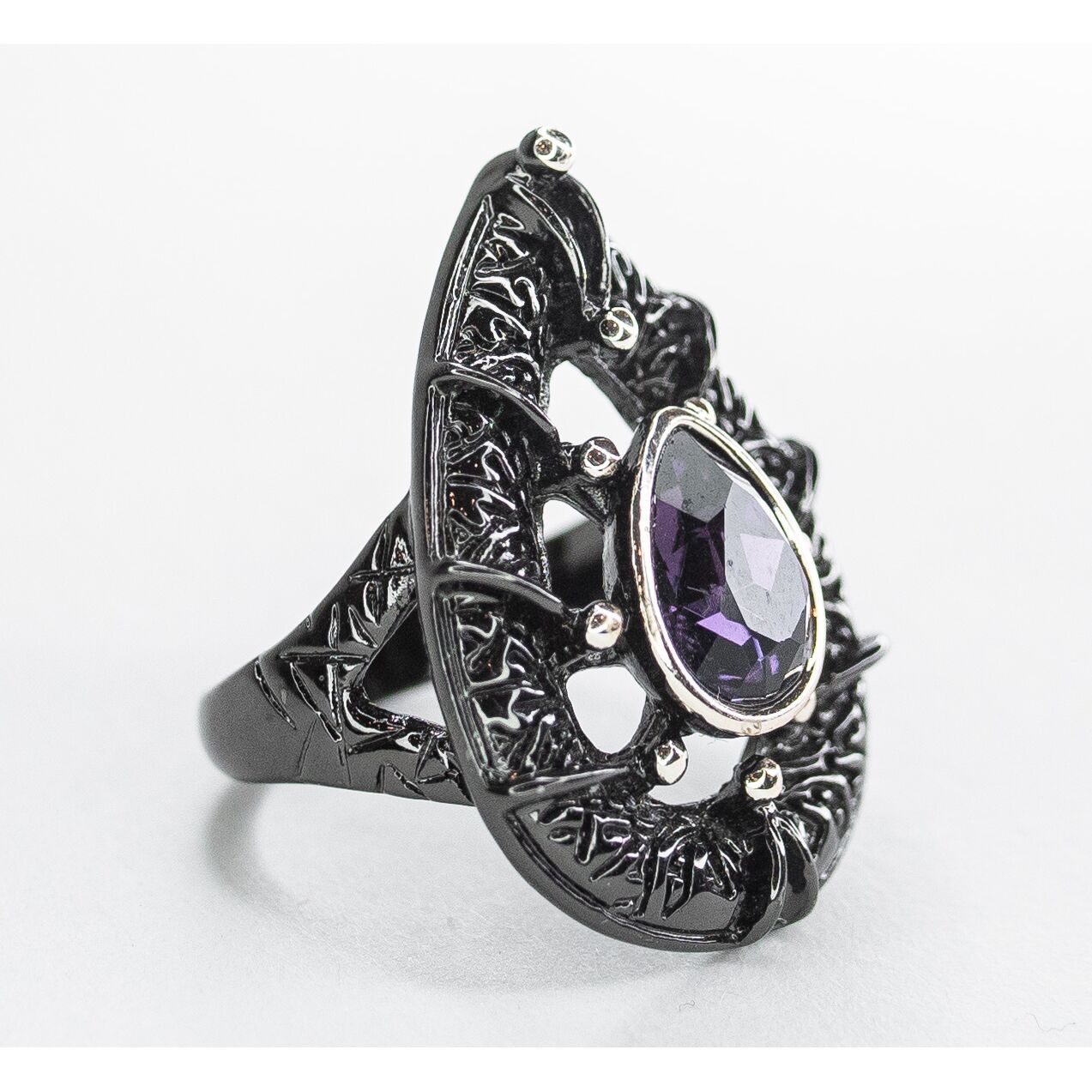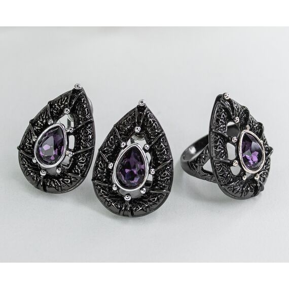 Кольцо женское из гипоаллергенного ювелирного сплава черного и серого цвета.Вставка- ювелирное стекло фиолетового цвета. Высота кольца-2,5см, ширина-2см. Размер-17,0.