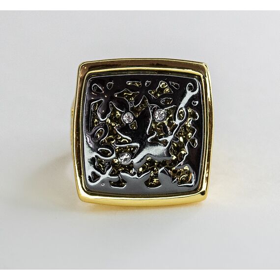 Кольцо из гипоаллергенного ювелирного сплава черного и желтого цвета. Вставка- ювелирное стекло, цвет- белый.Размер кольца-18,0, высота и ширина-2см.