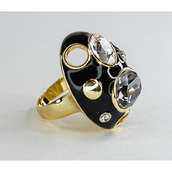 Кольцо женское из гипоаллергенного ювелирного сплава желтого цвета. Покрытие эмалью черного цвета. Вставка- ювелирное стекло белого и серого цвета. Высота кольца-3см, ширина -2,3см. Размер-17,0.
