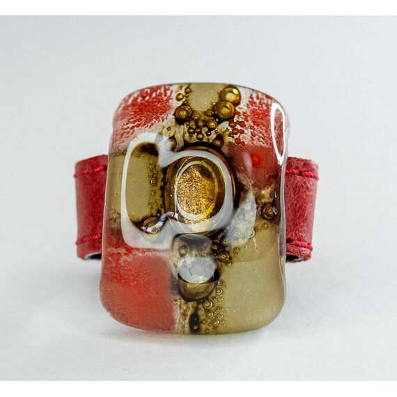 Кольцо женское из муранского стекла красного, коричневого цвета, на шинке из натуральной кожи красного цвета. Высота кольца-3,5см, ширина-2,0см. Размер-18,0.