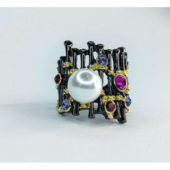 Кольцо из гипоаллергенного ювелирного сплава,цвет- черный. Вставка- иск. жемчуг белого цвета и ювелирное стекло,цвет_розовый,сиреневый,красный.Высота кольца-2см, ширина-2см. РАзмер кольца-18,0.