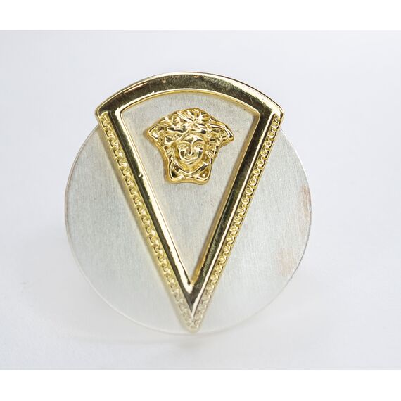 Кольцо женское из гипоаллеогенного ювелирного сплава серого и желтого цвета. Без вставок. Высота кольца-3,5см, ширина-3,5см. Размер-18,0.
