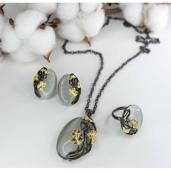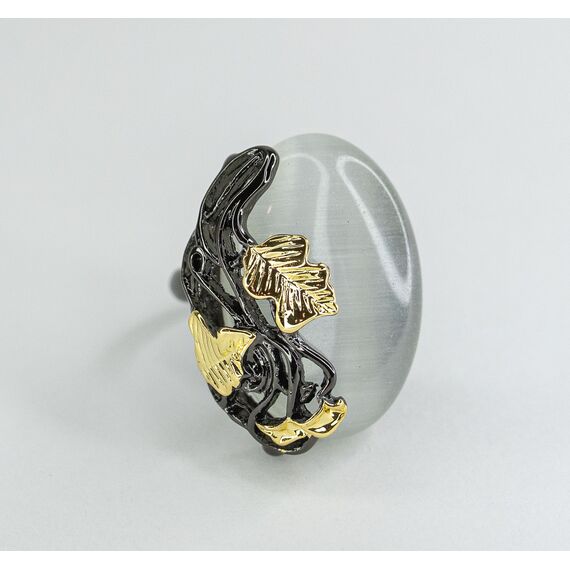 Кольцо женское из гипоаллергенного ювелирного сплава черного и желтого цвета. Вставка- улексит ( кошачий глаз) серого цвета. Высота кольца--3см, ширина-2см. Размер-17,0.