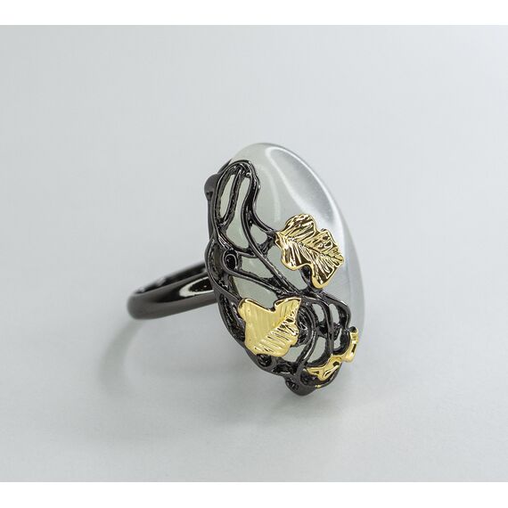 Кольцо женское из гипоаллергенного ювелирного сплава черного и желтого цвета. Вставка- улексит ( кошачий глаз) серого цвета. Высота кольца-3см, ширина-2,5см. Размер-18,0.