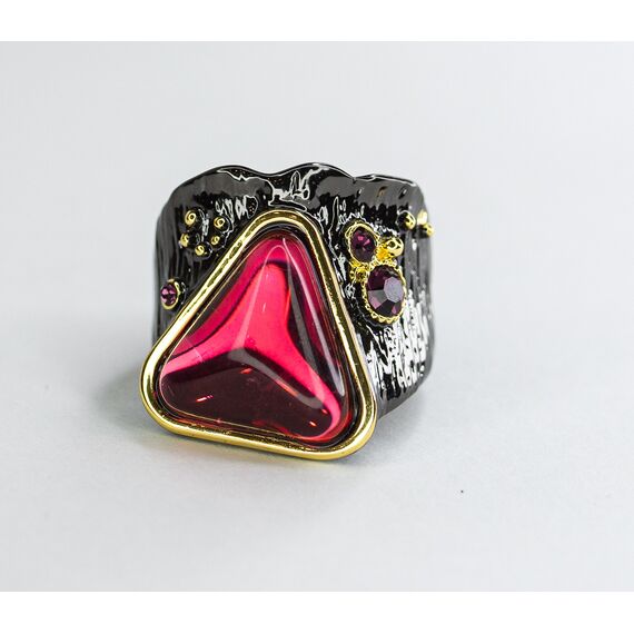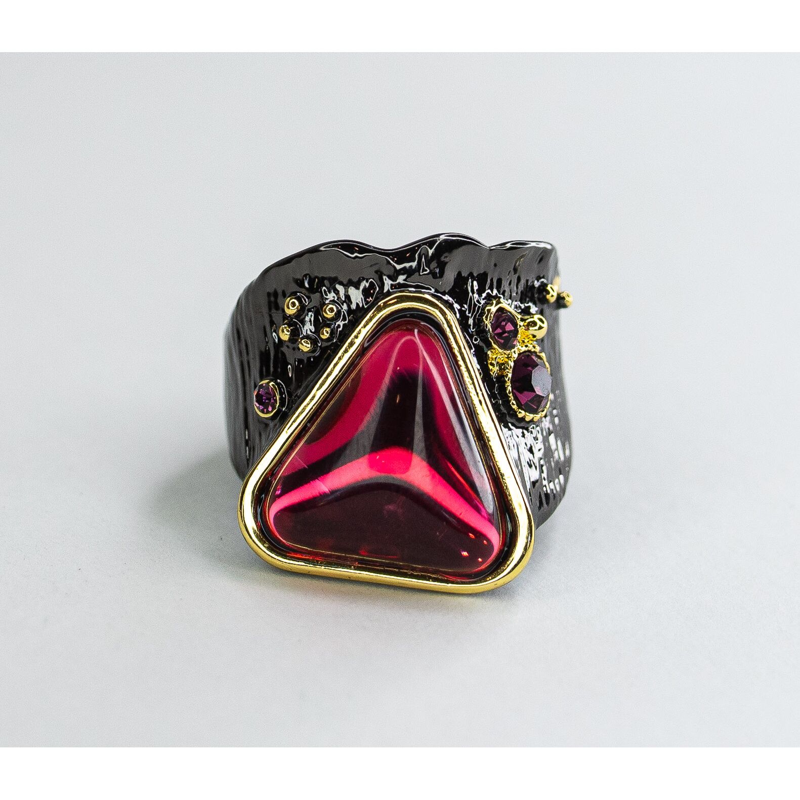 Кольцо женское из гипоаллергенного ювелирного сплава черного и желтого цвета. Вставка- улексит ( кошачий глаз) красного цвета и ювелирное стекло фиолетового цвета. Высота кольца -2,2см, ширина -2,2см. Размер-18,0.